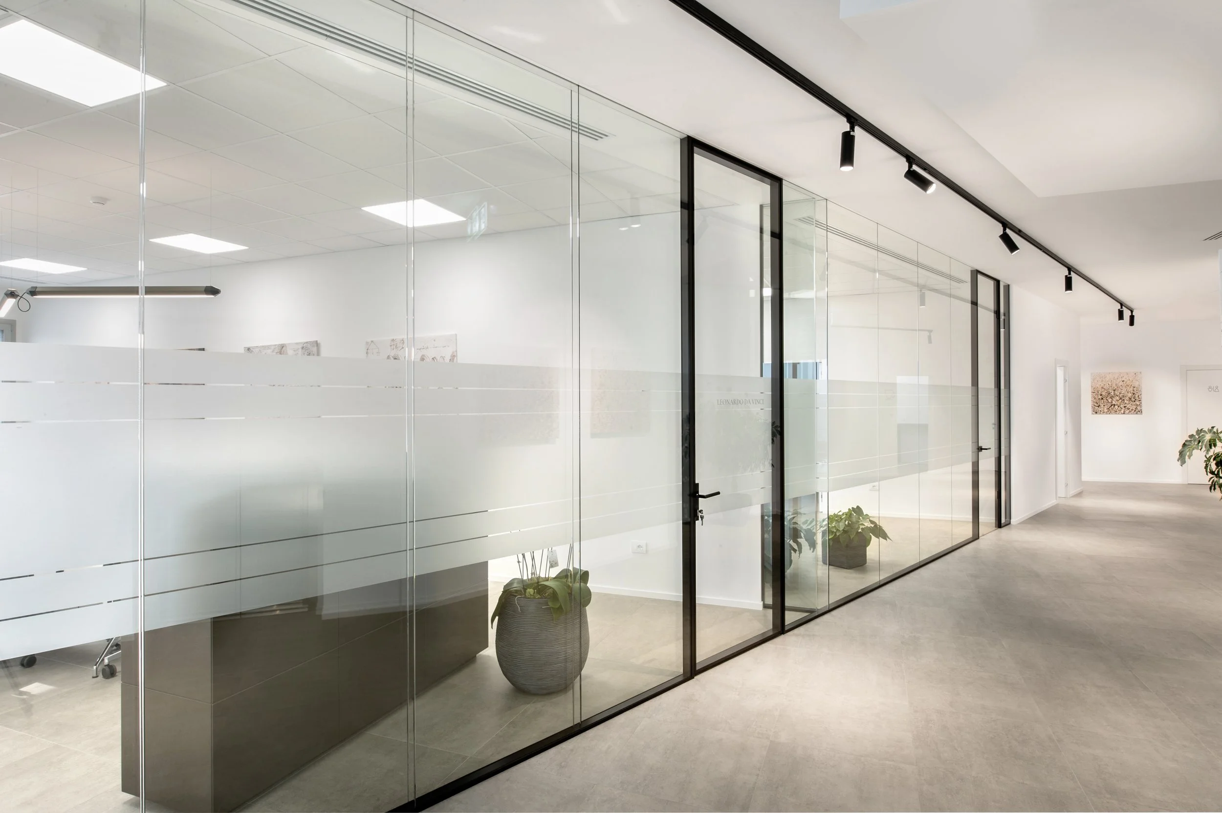 The Materia system boasts profiles under 1” high, which can be recessed into the floor and ceiling. The height of Italian design, Materia can reach up to 47 STC.
